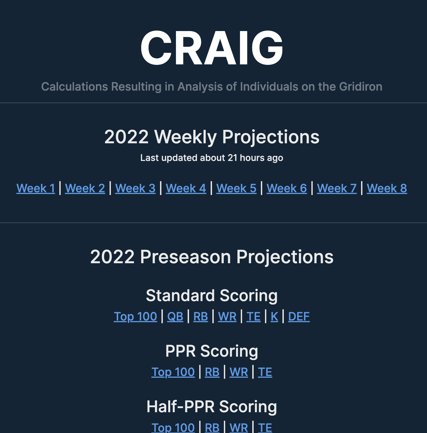 With CRAIG (Calculations Resulting in Analysis of Individuals on the Gridiron), Pastime Labs has branched out into football projections. Using a secret recipe of aggregation, based on significant research, study, and not a small amount of trial-and-error, CRAIG strives to be the most accurate predictor of relative value both before and during the fantasy football season. In fact, CRAIG created FantasyPros' most accurate rankings for Week 7 of the 2022 football season.