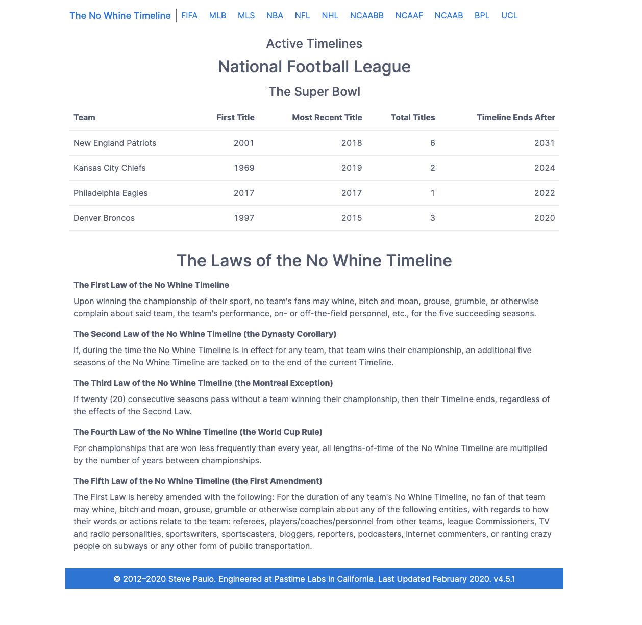 Not actually a projection system of any kind, the No Whine Timeline looks back over franchise histories in thirteen competitions covering baseball, basketball, football, soccer, and hockey at the national, international, and collegiate levels. The Timeline dictates whether fans of a particular team, nation, or school have the right to complain based on their recent and overall success.