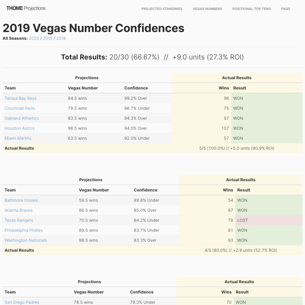 THOME, or the Team Handicapping and Odds Modeling Engine, was Pastime Labs' first big success story, correctly picking the winning side of MLB teams' Over/Under Wins (or "Team Totals") wagers 64 times from 2018-2020, or in 71% of chances. Simulating the entire MLB season 100,000 times for each run of the projections, THOME's confidence levels can be taken straight to the bank. OK, go to the sportsbook window first...
